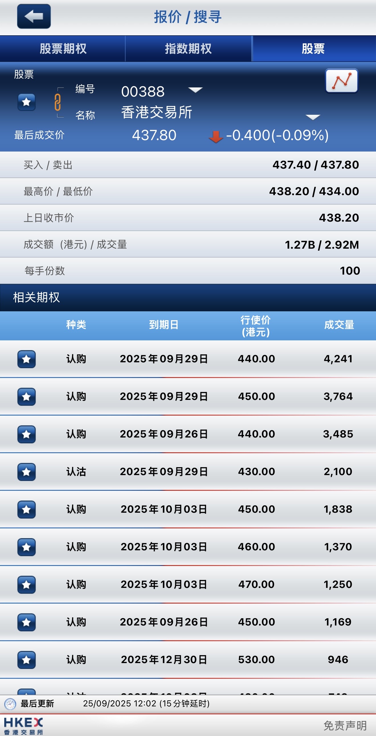 香港交易所早盘微跌0.09%,期权方面:9月29日到期行权价440港元的认购期权成交量居前,成交4241张合约。