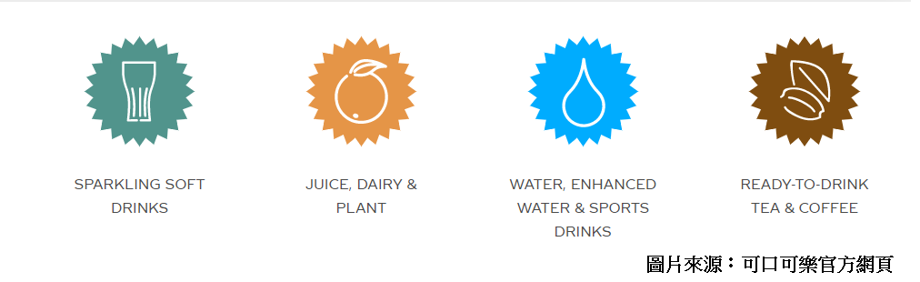 除了主力的碳酸饮品系列,集团还提供补水、运动、咖啡/茶、果汁、营养饮品、乳制品和植物性等饮品类别。较知名的非碳酸饮品品牌包括Dasani、Smartwater、维他命水、Costa、美粒果等。