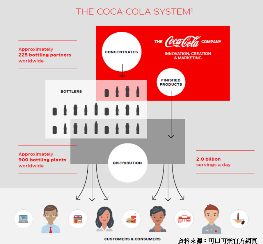 可口可乐公司将生产和销售部份浓缩饮品、糖浆和完成品的工作,授权予全球的200多个合作伙伴。透过它们分销至超市、餐厅、电影院、便利店等客户手中。