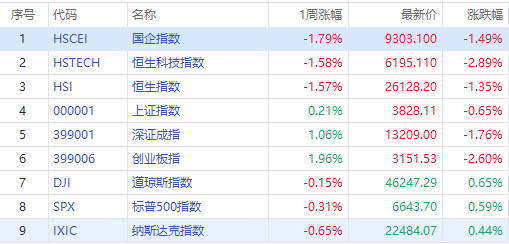 港股方面,本周恒生指数跌1.57%,报26128.2点;恒生科技指数跌1.58%,报6195.11点;国企指数跌1.79%,报9303.10点;