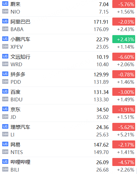 9月29日,明星中概股夜盘普涨,理想汽车涨超5%,阿里巴巴、哔哩哔哩、文远知行涨超2%,蔚来、拼多多、京东、百度、网易、小鹏汽车涨超1%。