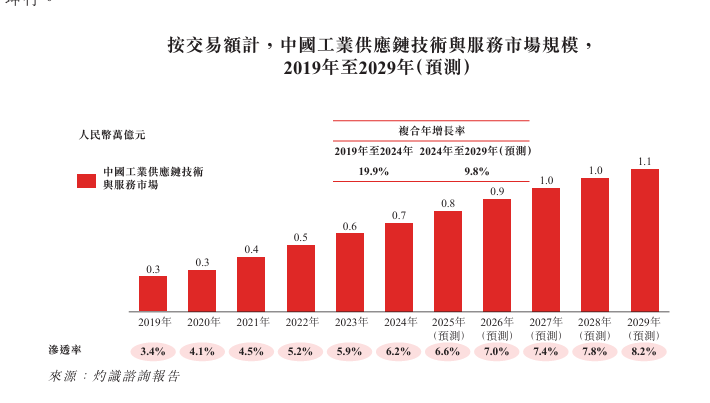 2024年中国工业供应链技术与服务市场规模以交易额计算为人民币0.7万亿元,预计到2029年将达到人民币1.1万亿元,复合年增长率为9.8%。于2024年,中国工业供应链技术与服务渗透率(即工业供应链技术与服务市场规模除以工业供应链市场规模)为6.2%,而美国的该渗透率约为15%。中国工业供应链技术与服务渗透率预计于2029年将增至8.2%。除本公司外,中国其他主要工业供应链技术与服务提供商包括西域、中电港、嘉立创集团及震坤行。