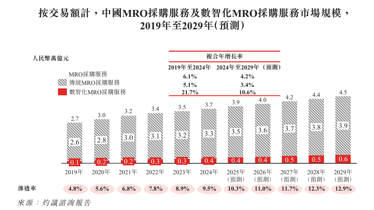 按交易额计,2024年中国MRO采购服务市场规模为人民币3.7万亿元,为美国的三倍多,且预计于2029年将达到人民币4.5万亿元,复合年增长率为4.2%。除本公司外,中国其他主要MRO采购服务提供商包括西域、鑫方盛、得力集团及震坤行。
