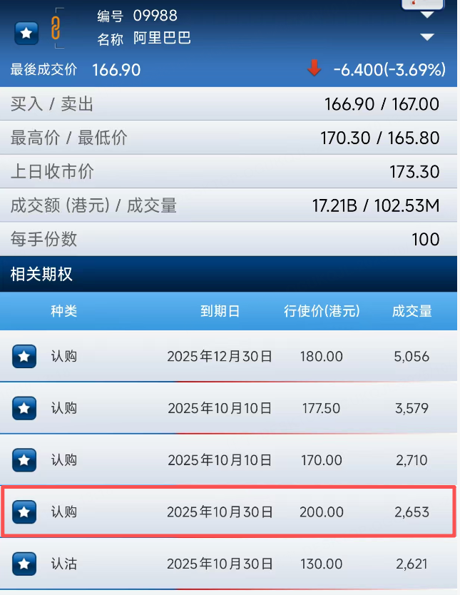 阿里巴巴认购合约依然活跃,其中一份10月30日到期的CALL,行权价高达200港元,较现价有20%以上的涨幅空间。您认为阿里巴能够结束连跌开启反弹吗?