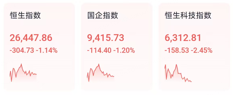 10月10日周五,港股三大指数上午走低,恒生科技指数午间收跌2.45%险守6300点,恒生指数、国企指数分别下跌1.14%及1.2%。大型科技股集体走低,百度跌5.39%,阿里巴巴跌近4%,腾讯跌近3%,京东集团、美团跌超1%。