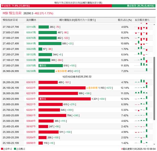 过去5日,恒指牛证合计约3.16亿港元资金净流入;恒指熊证则合计约2.01亿港元资金净流出套现。街货分布方面,至上周五,恒指牛证街货占比约71.8%,分布在收回价25900点至26300点之间,累计相当约4002张期指合约;恒指熊证街货在收回价26900点至27100点之间,累计相当约1031张期指合约。