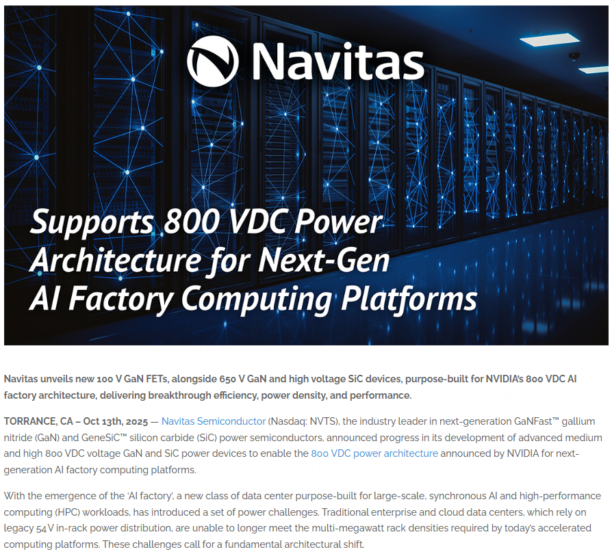 10月14日,纳微半导体盘后飙涨逾40%!公司宣布支持英伟达下一代人工智能工厂计算平台的800Vdc电源架构。
