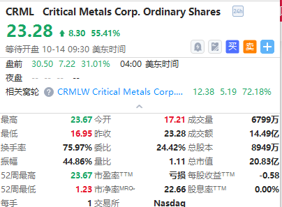 华盛资讯10月14日讯,美股稀土概念股再度狂飙,Critical Metals $CRML 涨超30%,隔夜涨超55%;USA Rare Earth $USAR 涨超8%,Energy Fuels $UUUU 涨超7% , $MP 涨超7%。