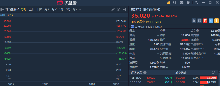 华盛资讯10月14日讯,港股轩竹生物-B正在暗盘交易中,截至发稿涨超201%,报35港元/股,中签一手账面浮盈11710港元,最新总市值超181亿港元。该股预计将于10月15日正式挂牌上市,配售结果将于今日晚间披露。