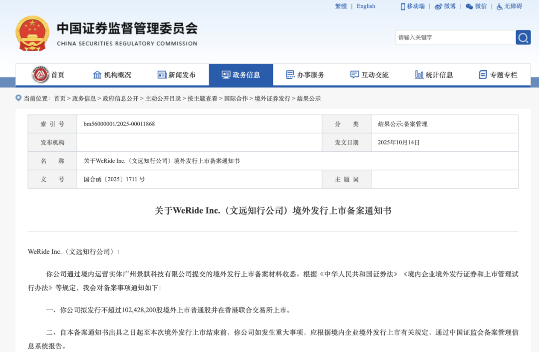 中国证监会披露《关于WeRide Inc.(文远知行公司)境外发行上市备案通知书》。根据备案通知书,拟发行不超过102,428,200股境外上市普通股并在香港联合交易所上市。