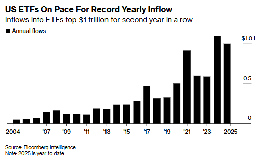 分析师预测,2025年全年ETF资金流入额可能达到1.25万亿美元左右,资金流入速度刷新了该行业30年历史中的所有纪录。