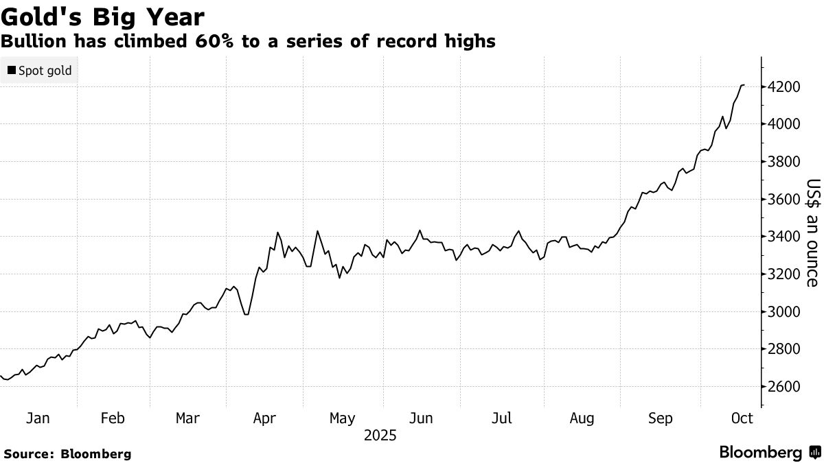 黄金仍未停下其上涨的步伐。截至发稿,黄金现货涨0.35%,报每盎司4223.13美元。贸易紧张局势升级以及市场对美联储将在年底前加大货币宽松力度的押注支撑了对黄金的避险需求,并推动黄金持续创下新高。本周迄今,黄金已上涨近5%,自8月中旬以来的迅猛涨势持续不减,年内涨幅接近60%。买盘热潮也扩散至其他贵金属。白银现货周三上涨3.1%,原因是伦敦市场供应依然紧张。交易员正纷纷押注美联储将在年底前至少实施一次幅度降息。而美联储主席鲍威尔本周暗示,美联储计划在本月稍晚再降息25个基点。较低的借贷成本通常利好贵金属,因为黄金等资产不产生利息收入。