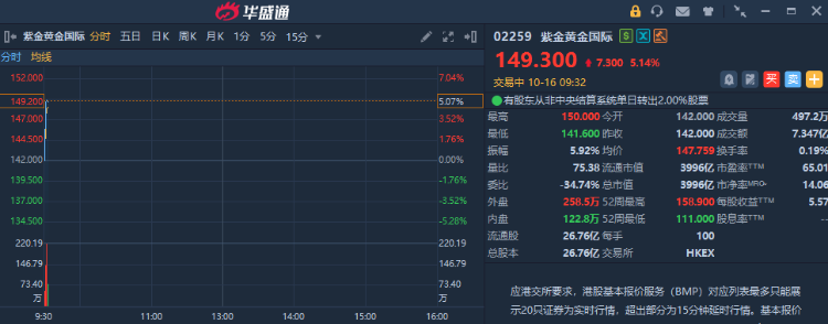 华盛资讯10月16日讯,港股黄金板块开盘走强,大唐黄金涨超9%,珠峰黄金涨超6%,紫金黄金国际涨逾5%,中国白银集团涨近5%。