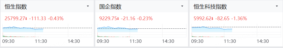 10月16日,港股三大股指齐跌,截止午间收盘,恒生指数跌0.43%,恒生科技指数跌1.36%,国企指数跌0.23%。