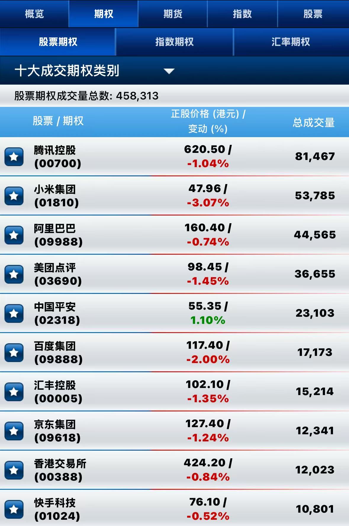 截止午间收盘,港股期权半日成交近46万张。其中,腾讯控股成交量居前,期权成交超8.1万张;小米集团-W名列次席,期权成交超5.3万张;阿里巴巴-W位居第三,期权成交超4.4万张。