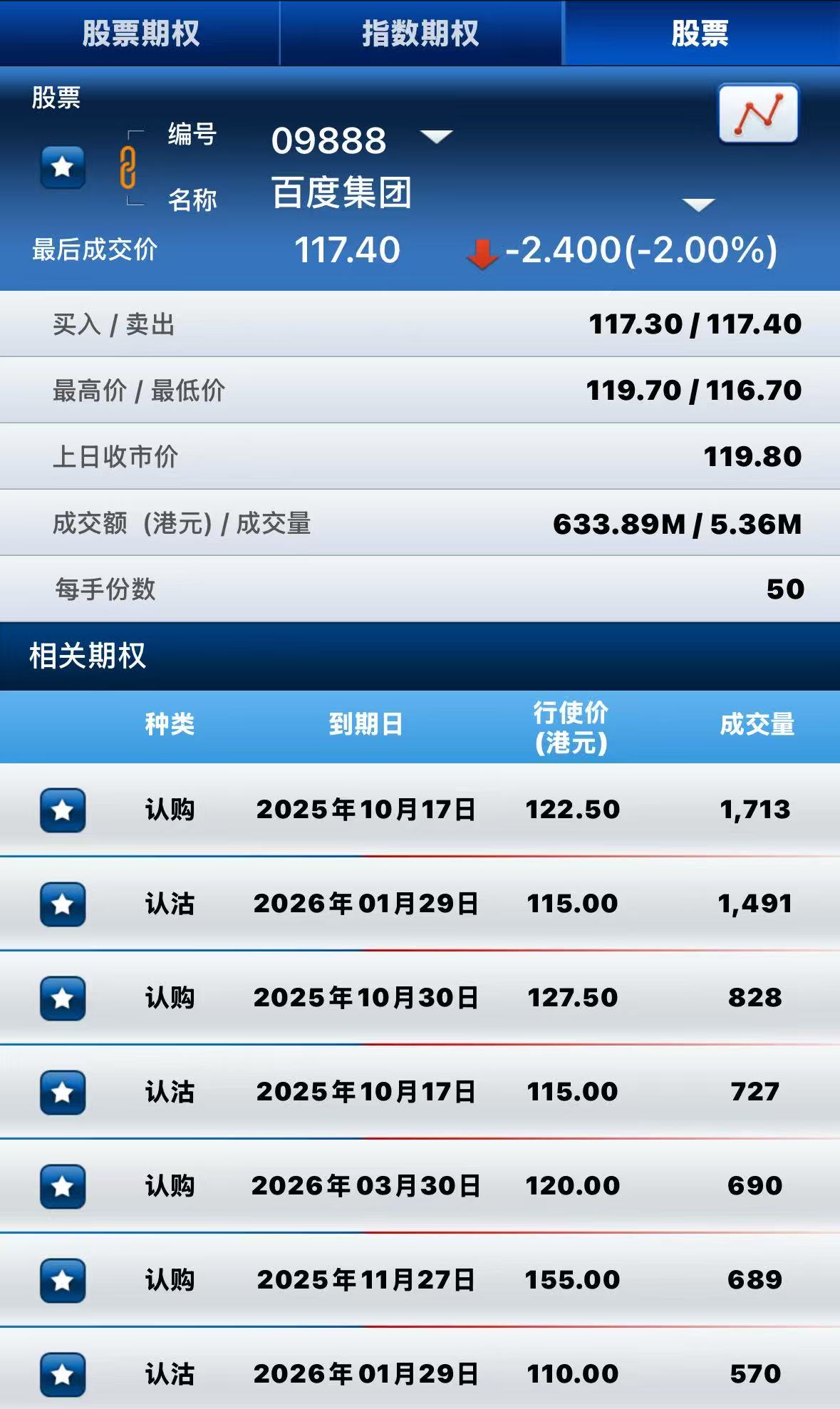 百度集团-SW下跌2%,期权方面:半日成交超1.7万张合约,其中于10月17日到期行权价122.50港元的认购期权成交量居前,成交超1700张合约。 $BIU.HK 20251017 122.50 CALL$