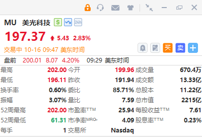 华盛资讯10月16日讯,美光科技(MU.US)一度涨超5%,最高触及202美元,创历史新高,现涨近3%。消息面上,摩根士丹利将美光科技的评级从“持股观望”上调至“增持”,目标价从160美元大幅上调至220美元,核心DRAM产品的价格上涨势头持续超出市场预期。
