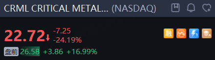 稀土概念股重拾涨势, CRITICAL METALS CORPORATION 大涨17%, American Resources Corporation 涨超8%,MP Materials Corp.涨超3%,USA Rare Earth Inc. 涨超2%。