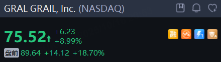 医药公司 GRAIL, Inc. 大涨18%,三星子公司同意对该公司进行投资,将把GRAIL的癌症早期检测测试引入亚洲。