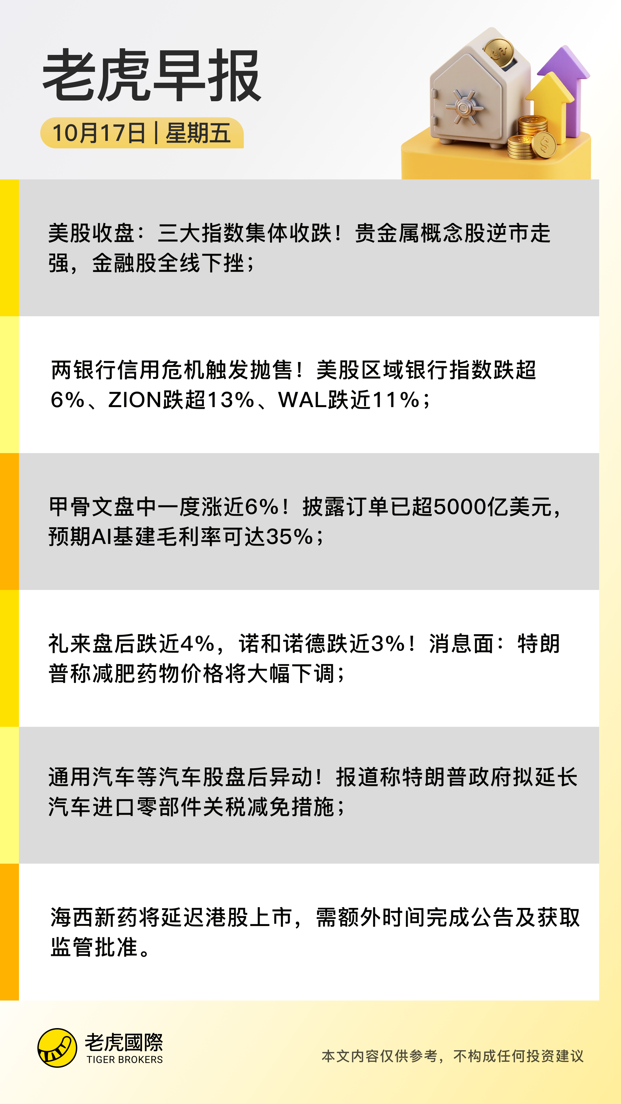 金融股集体大跌,区域银行ETF跌6.2%,银行指数ETF跌超5%;Zions Bancorp跌13.14%,阿莱恩斯西部银行跌10.83%,杰富瑞跌10.62%,哥伦比亚银行系统跌7.92%,北加利福尼亚国民银行跌7.8%。