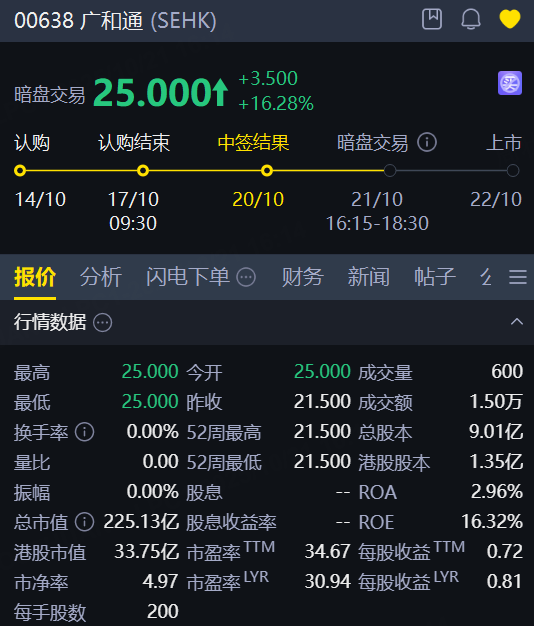 10月21日,广和通暗盘涨超16%,总市值突破220亿港元;不计手续费,中签一手赚700港元;公司每股定价21.5港元,每手200股,将于10月22日(周三)正式挂牌交易。