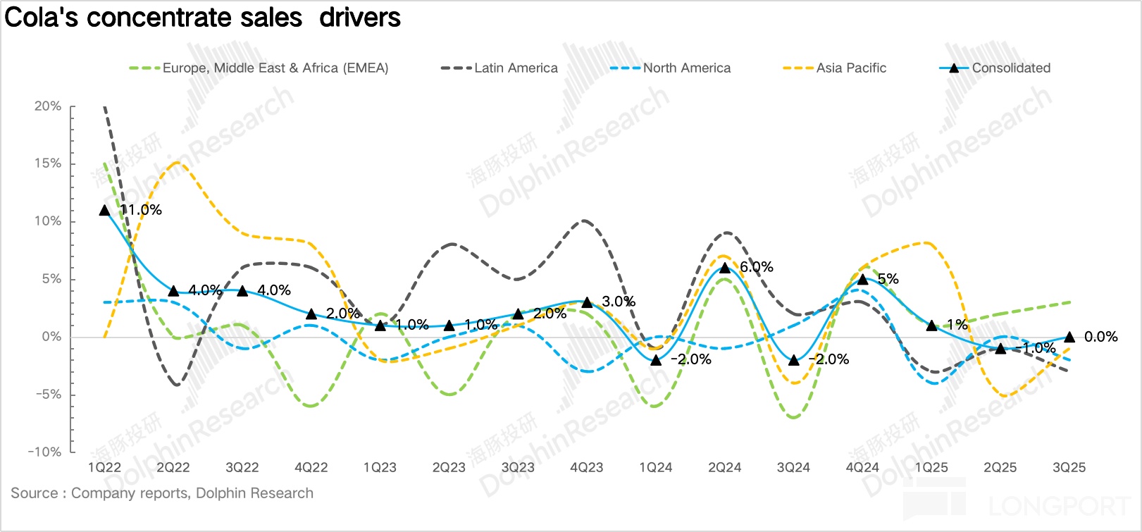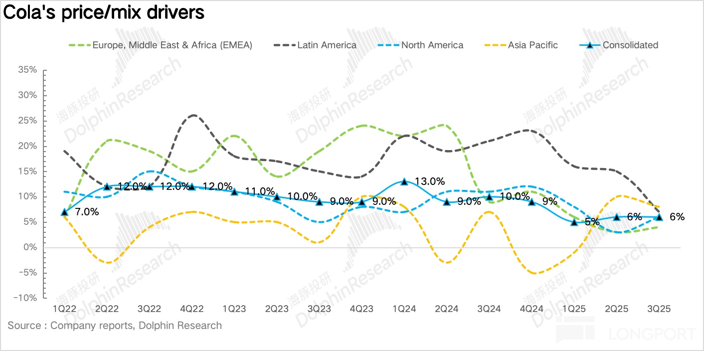价:3Q25 浓缩液价格同比增长 6%,仍然是可口可乐内生增长的关键驱动因素。从区域上看,拉美和亚太地区是价格提升的主要驱动因素,而北美和欧洲受到高基数影响价格贡献稍有放缓。