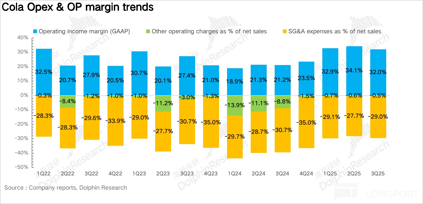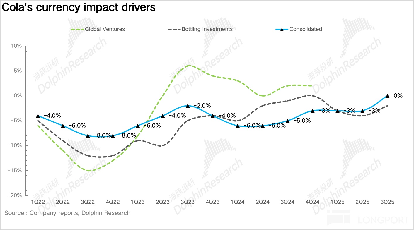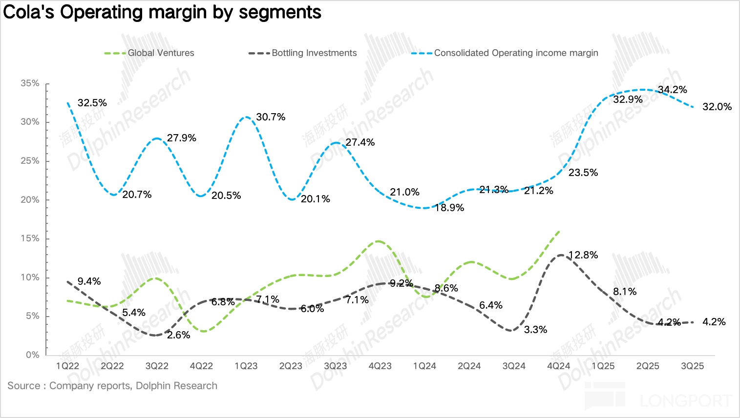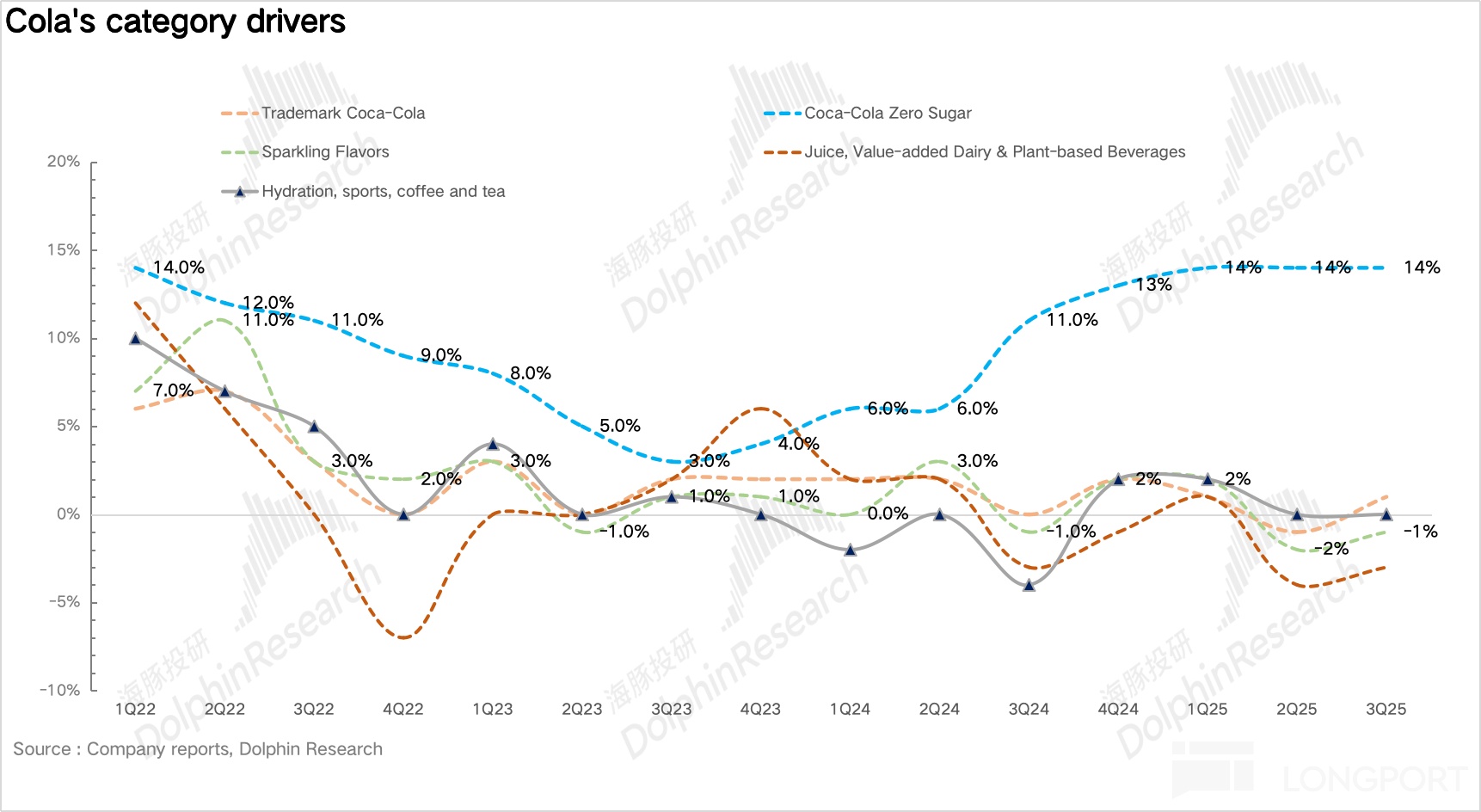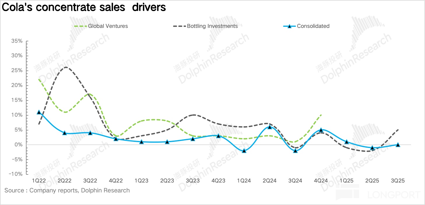 果汁、增值乳制品和植物性饮料同比下滑 3%,降幅环比有所收窄。结合电话会信息,其中超滤牛奶 Fairlife 凭借高钙、高蛋白、低乳糖等优势在健康化浪潮中保持了非常强劲的增长,目前依然处于供不应求的状态,海豚君预计伴随 2026 年初可口可乐在纽约的新工厂达产,产能瓶颈逐步缓解有望带动 Fairlife 的销量再上一个台阶,而传统果汁(果粒橙、酷儿等品牌)由于含糖量高,基本已被消费者打上了不健康的标签,需求持续萎缩。