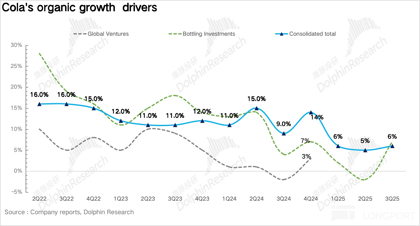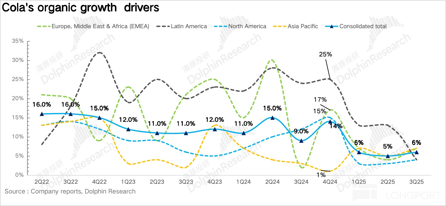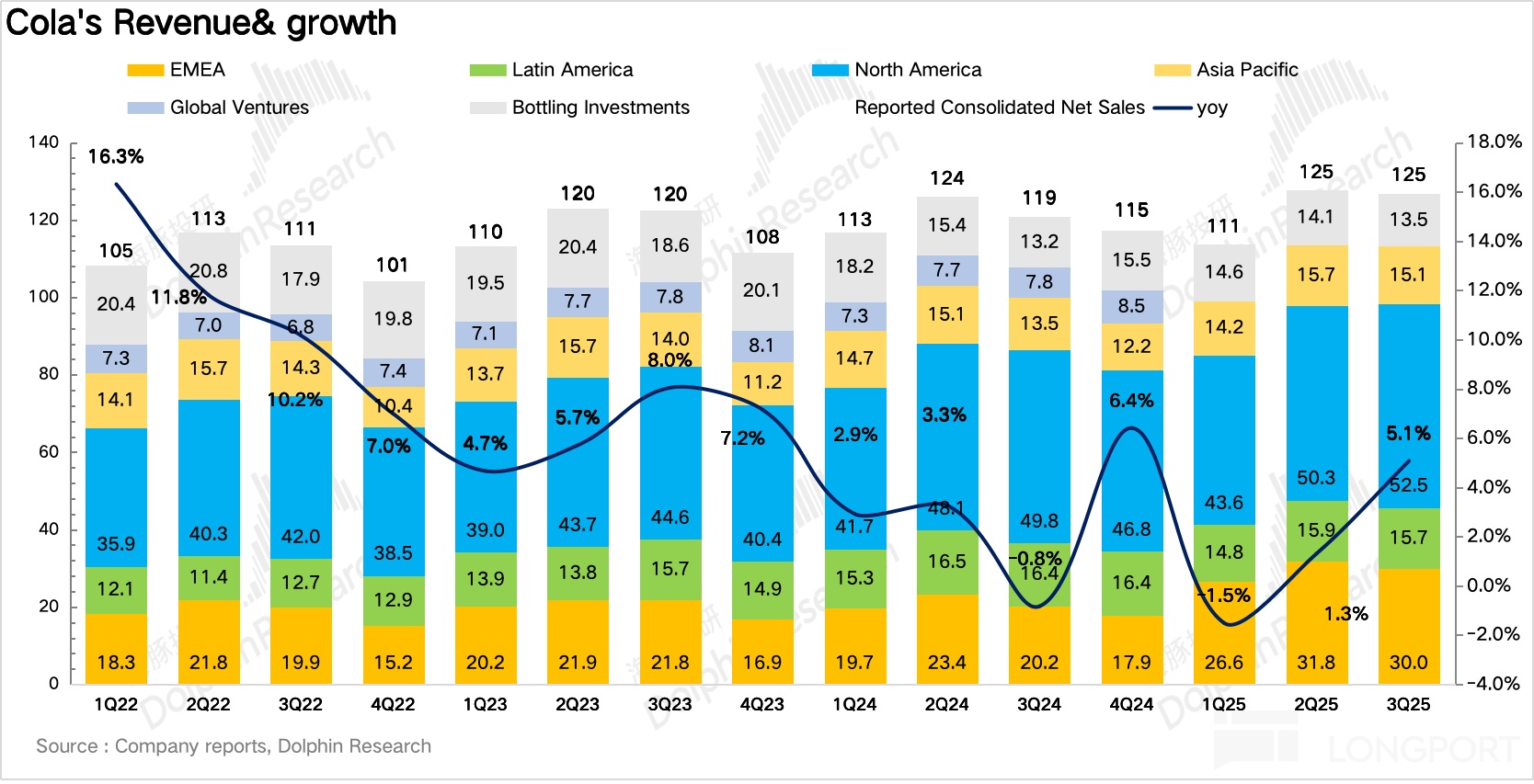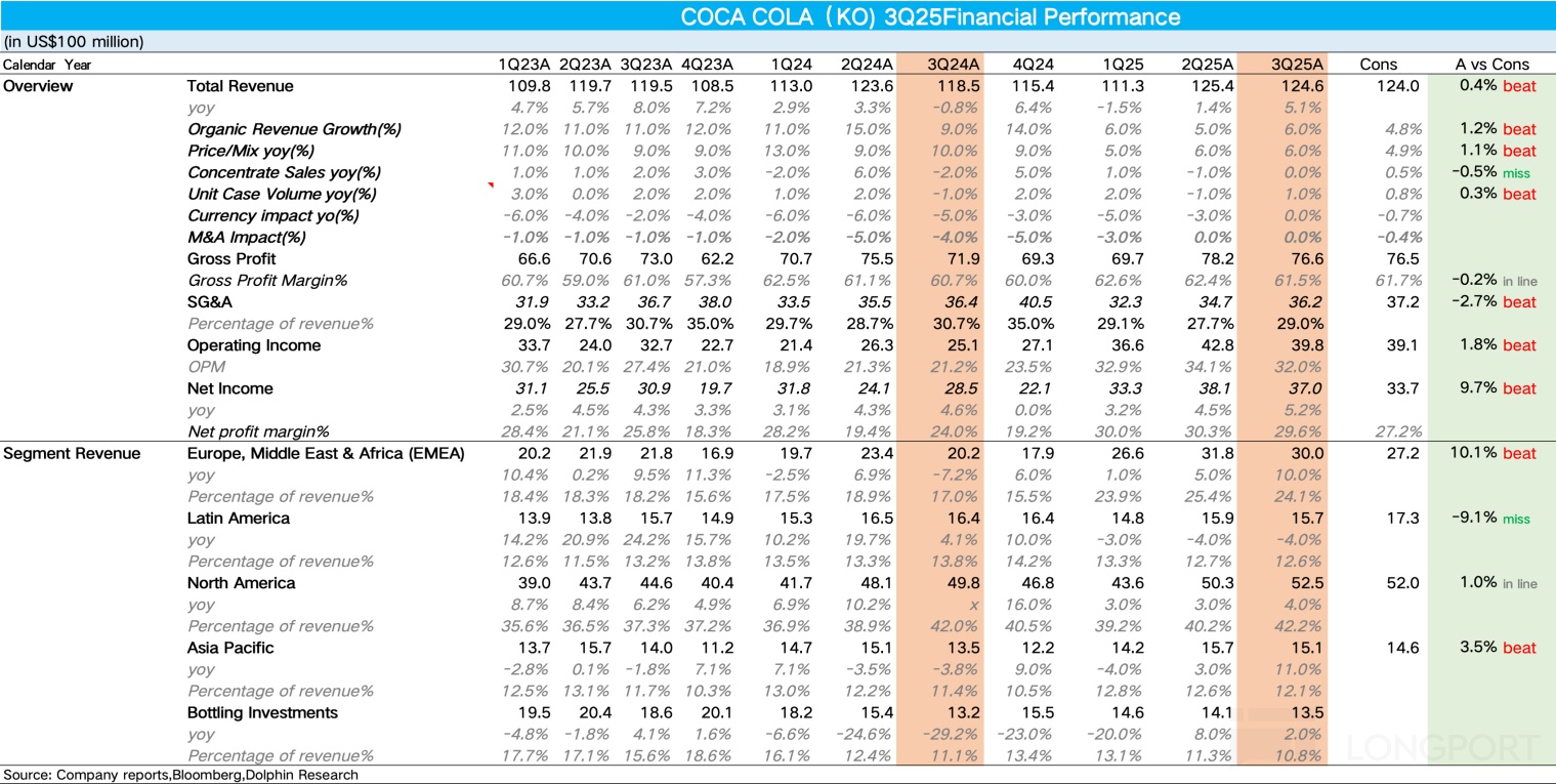 3Q25 可口可乐实现表观营收 124.6 亿美元,同比增长 5.1%,小幅超出市场一致预期。其中内生营收(Organic revenue)同比增长 6%。