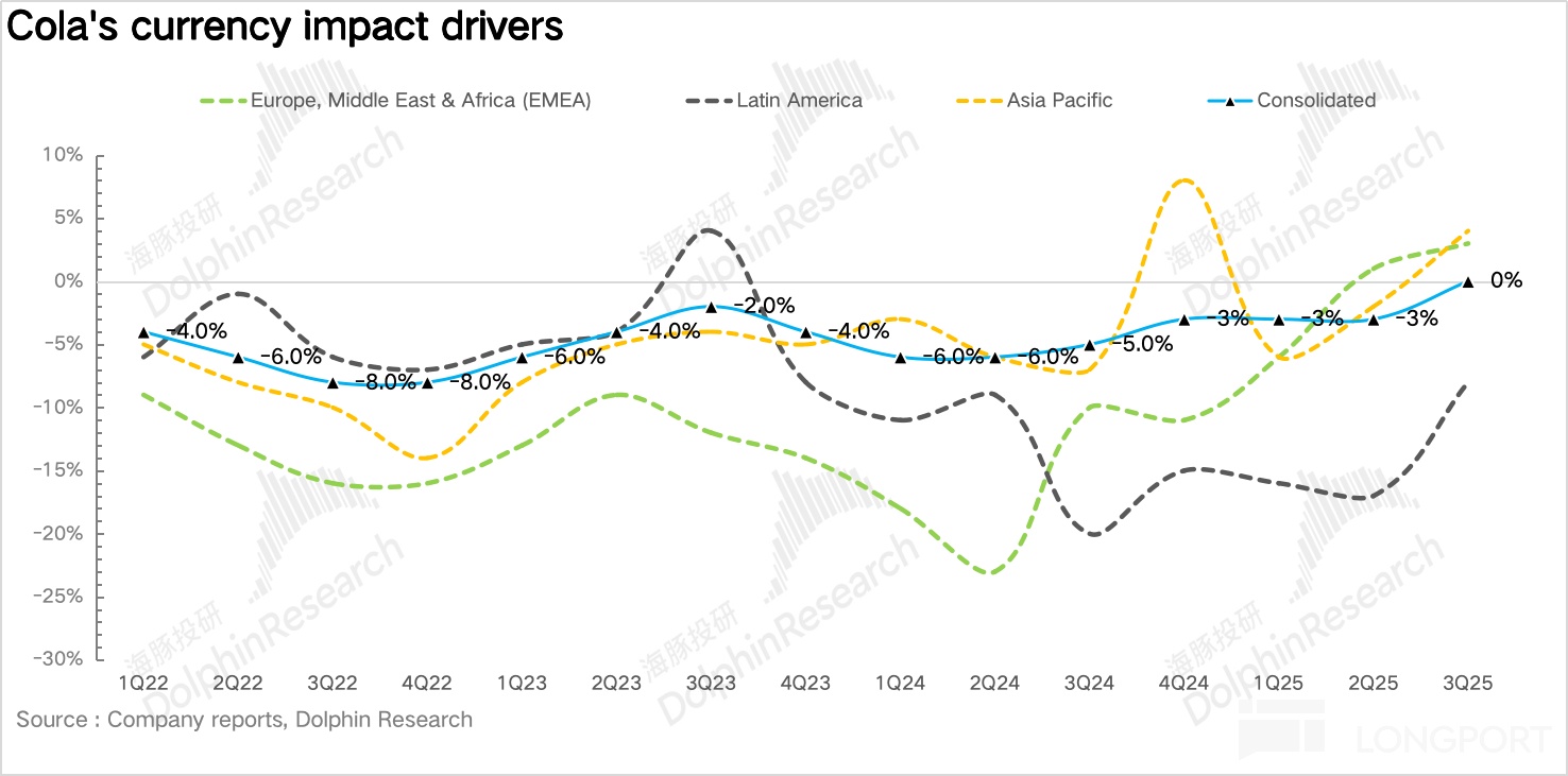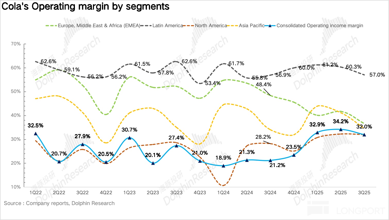 拉美地区实现营收 15.7 亿美元,同比下降 4%,核心在于墨西哥、哥伦比亚等地区受到高利率、收入增长缓慢等宏观因素影响,居民消费意愿持续低迷。此外,汇率逆风虽然在三季度有所缓解,但拉美地区仍然是可口可乐全球范围内结构性逆风的最主要来源之一。