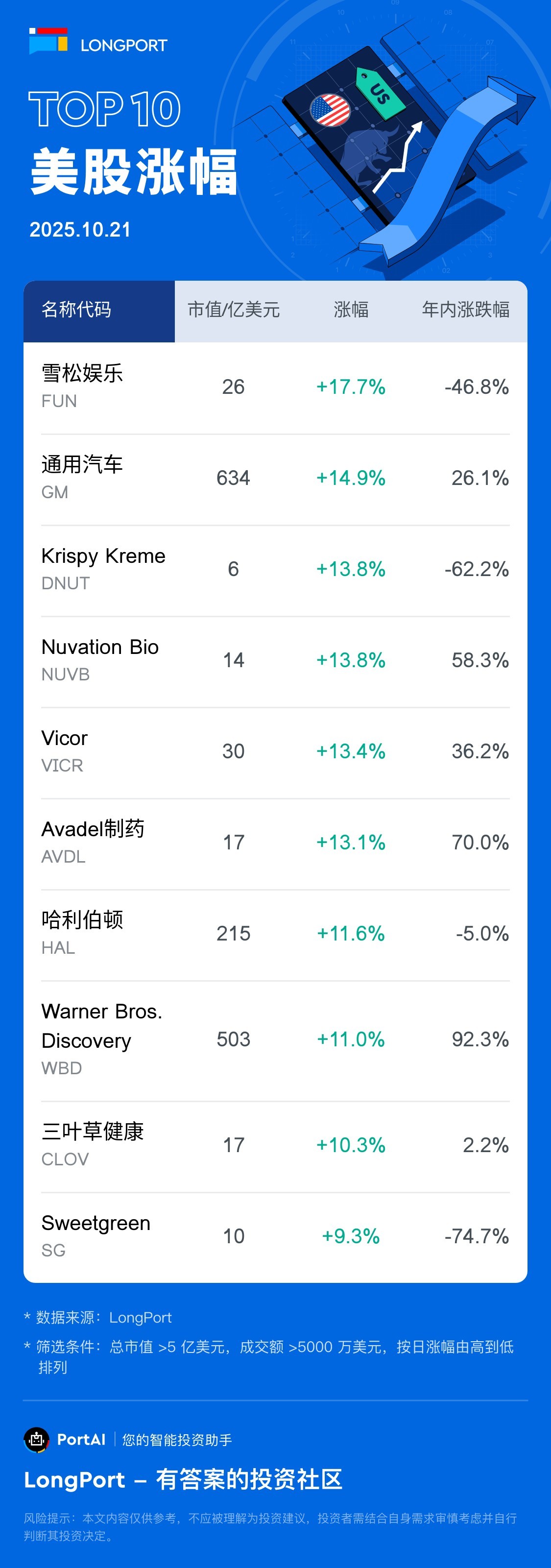 雪松娱乐 (FUN) 涨 17.73%,成交额 4.0 亿美元,年内累计跌 46.8%。