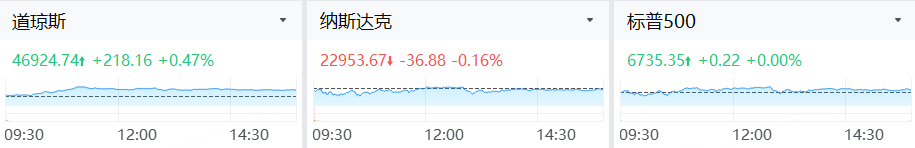 截至收盘,道琼斯指数涨0.47%,报46,924.74点;标普500指数平收,报6,735.35点;纳斯达克指数跌0.16%,报22,953.67点。