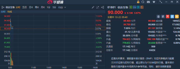 华盛资讯10月22日讯,港股生物医药板块早盘走好,信达生物一度涨近10%,现涨超3%,此前公司与武田制药达成全球战略合作。