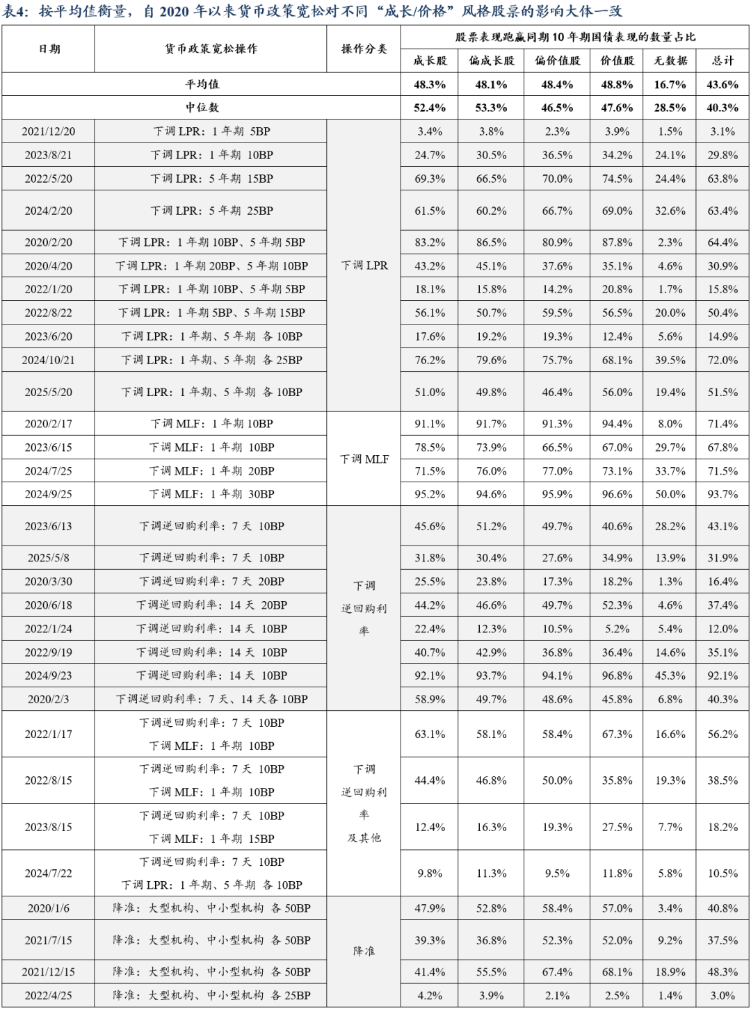 最后,我们以历次货币政策宽松日期为T日,计算自T-1日(收盘价)至T+1日(收盘价)的10年期国债中债估值净价变动幅度、A股主要个股区间收益。通过对比不同风格的样本个股跑赢同期债券表现的数量占比,衡量历史上的货币政策宽松曾经利好哪些A股资产。