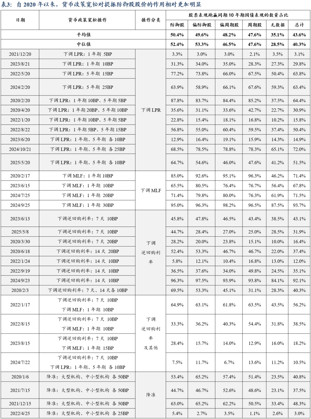 (3)当货政宽松带来债市“走熊”时,如果权益市场对产业基本面及上市公司利润、现金流改善预期不明确,那么货币政策或难改变权益市场主线,防御股仍有可能大比例跑输同期债券表现。