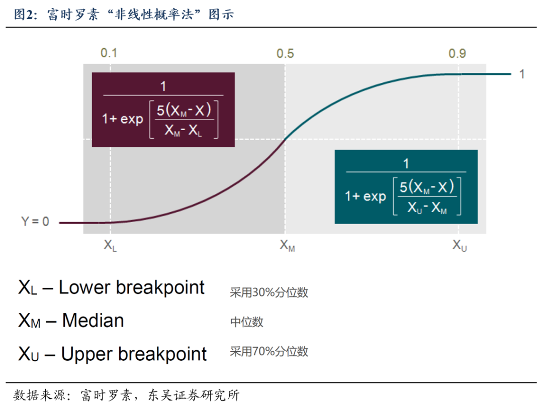 以区分成长型或价值型为例,非线性概率法的具体步骤是:首先根据相关指标对个股计算得分(CVS),随后对低于一定分位数(降序排列)的完全归于成长型股票;高于一定分位数的完全归于价值型股票;介于中间的部分归于成长型、部分归于价值型,但总和等于100%。