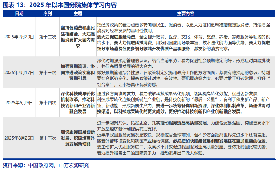 年初以来,高层会议及集体学习或已勾勒出“十五五”产业结构调整的部分“蓝图”。截至8月底,2025年中央政治局共开展三次集体学习,其中4月主题为“加强人工智能发展和监管”。国务院同期共组织四次集体学习,2月提出“大力促进服务消费、科技消费”,4月强调“深化科技成果转化机制改革,推动科创与产业创新融合”,8月则明确“加快服务贸易创新发展,培育外贸新动能”。
