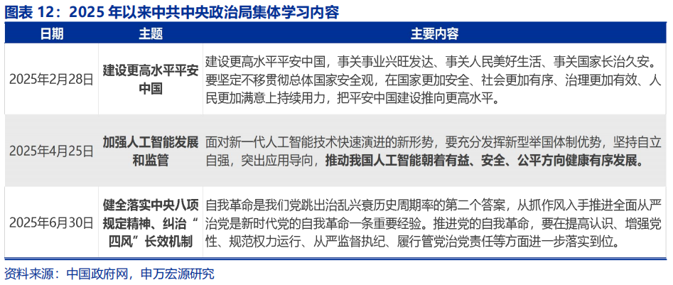 年初以来,中央政治局和国务院组织的集体学习中,包含人工智能等科创前沿及服务消费、服务贸易等产业结构调整相关内容,或已勾勒出“十五五”产业结构调整的部分“蓝图”。截至8月底,2025年中央政治局共开展三次集体学习,其中4月主题为“加强人工智能发展和监管”,习近平总书记强调“要正视差距、加倍努力,全面推进人工智能科技创新、产业发展和赋能应用。”国务院同期共组织四次集体学习,2月提出“大力促进服务消费、科技消费”,4月强调“深化科技成果转化机制改革,推动科创与产业创新融合”,8月则明确“加快服务贸易创新发展,培育外贸新动能”。