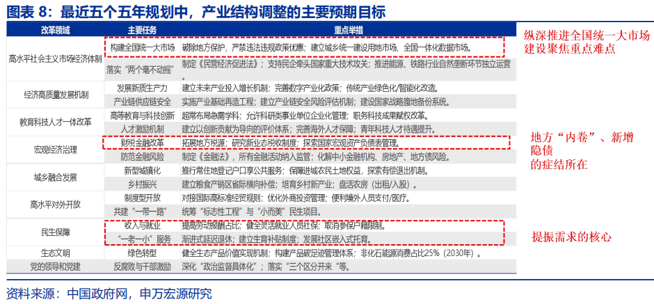 2)高质量发展、制度改革、产业转型升级或是新“五年规划”的三大主线。即便“十四五”规划已淡化经济总量目标、重视结构发展,但实现社会主义现代化建设目标,或仍对“十五五”经济增速有一定要求。二十届三中全会部署的300多项改革任务要求2029年前完成,或指向未来五年亦是进一步全面深化改革的关键时期。从五年规划的目标设定与实施逻辑来看,产业转型升级不仅是五年规划的重要组成部分,更是实现规划核心目标的“关键手段”。
