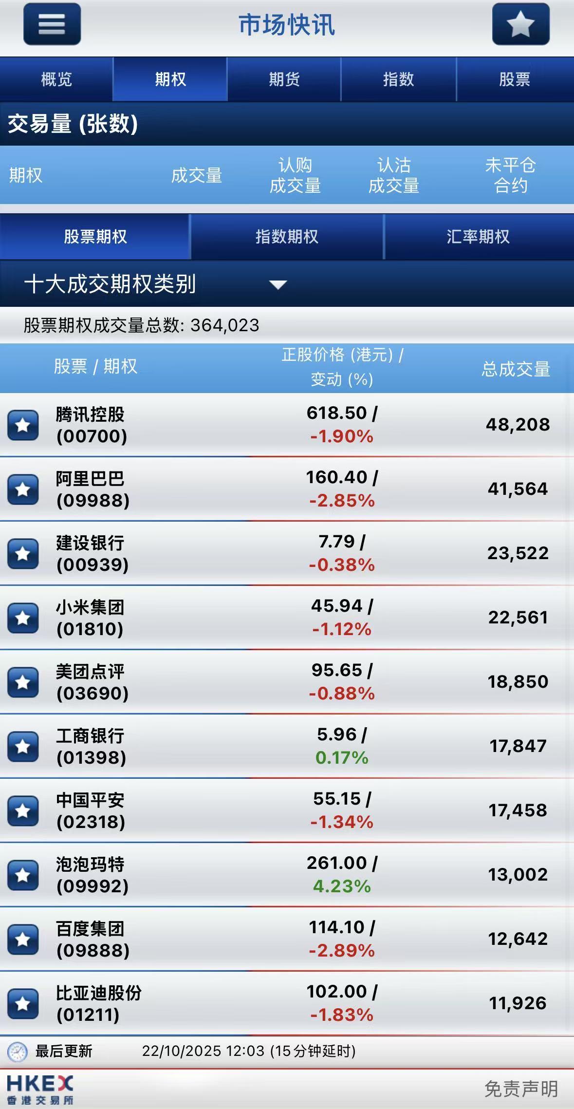 截止午间收盘,港股期权半日成交36.4万张,其中,腾讯控股成交量居首,期权成交4.82万张;阿里巴巴-W名列次席,期权成交4.16万张;建设银行位居第三,期权成交2.35万张。