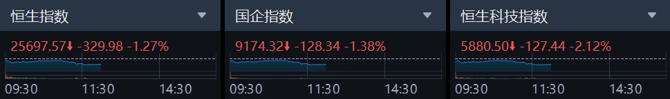 10月22日,港股上午盘三大指数集体下跌,临近午盘呈加速走低行情,恒生科技指数跌幅做大,午间收跌2.12%,恒生指数跌1.27%再度失守26000点,国企指数跌1.38%。
