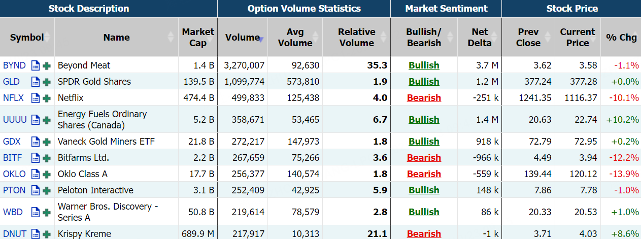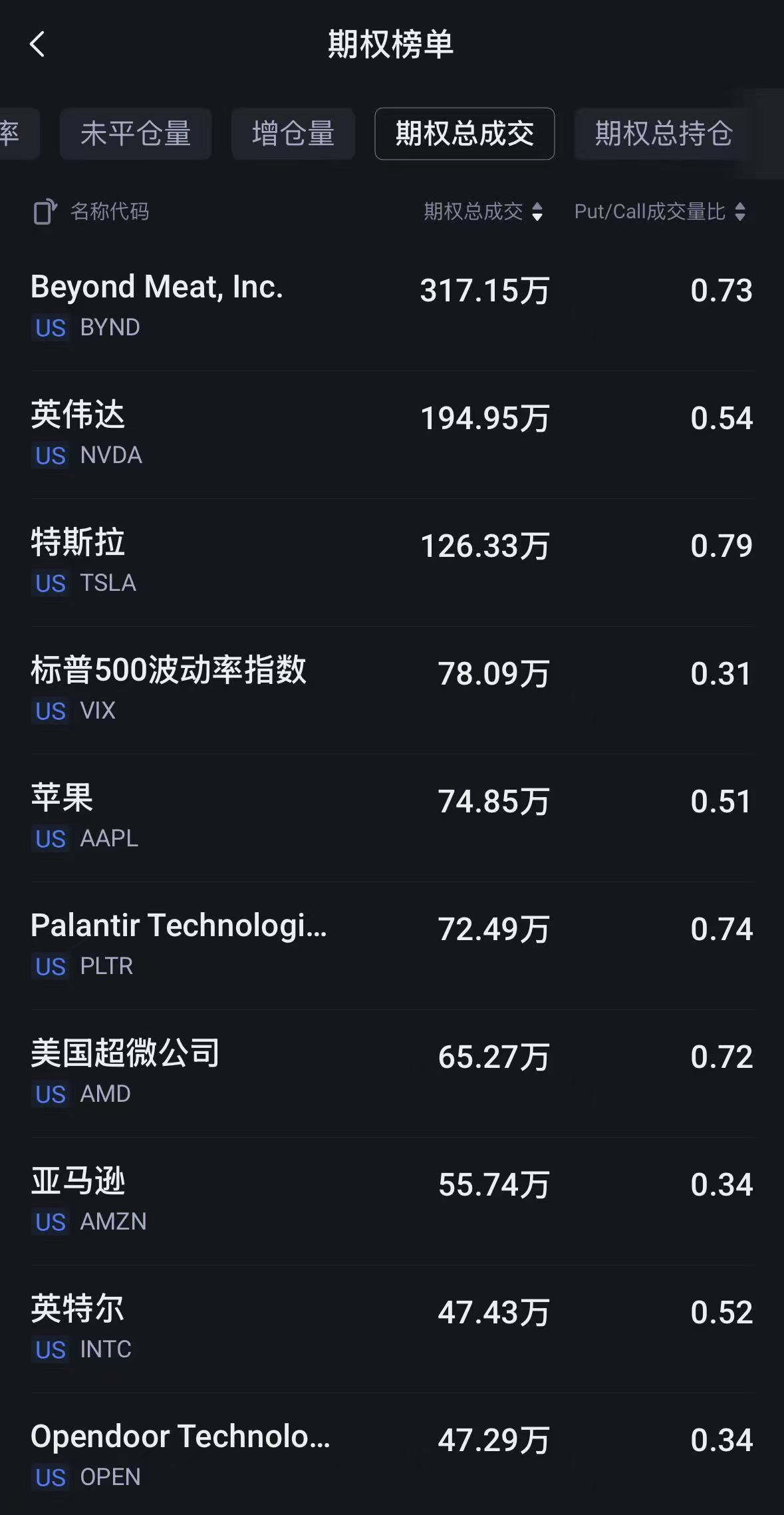 周三,期权市场总成交量6088.74万张合约,高于90日均量;Beyond Meat当日期权成交超317万张,看跌期权占比大幅攀升,其中于本周五到期3美元行使价的看跌期权成交逾14万张>>