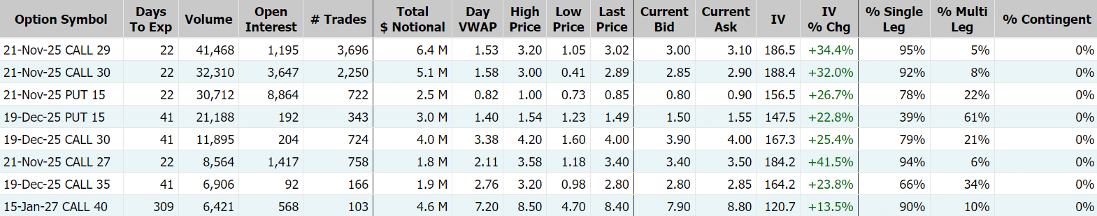 期权方面,Energy Fuels当日期权成交近36万张,较90日均量放大逾6倍,看涨期权占比升至74%,其中于11月21日到期的29美元行使价的看涨期权成交居前,成交超4万张。 $UUUU 20251121 29.0 CALL$
