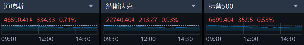 美东时间周三,随着贸易紧张局势再度升温,三大指数集体收跌,纳指跌近1%,跌幅领跌主要股指。截至收盘,道琼斯指数跌0.71%,报46590.41点;标普500指数跌0.53%,报6699.40点;纳斯达克指数跌0.93%,报22740.40点。
