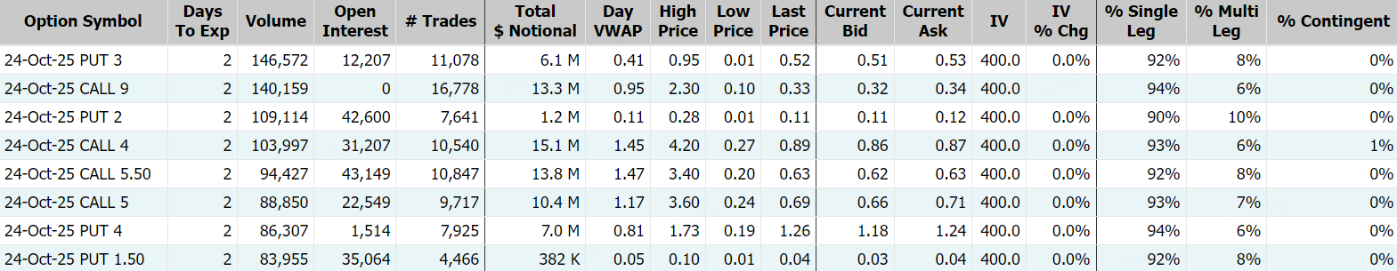 期权方面,Beyond Meat当日期权交易量续创历史记录,成交超317万张,仍占据期权总成交榜首位置,但看跌期权占比大幅攀升至42.8%,其中于10月24日到期的3美元行使价的看跌期权成交居前,成交逾14万张。 $BYND 20251024 3.0 PUT$