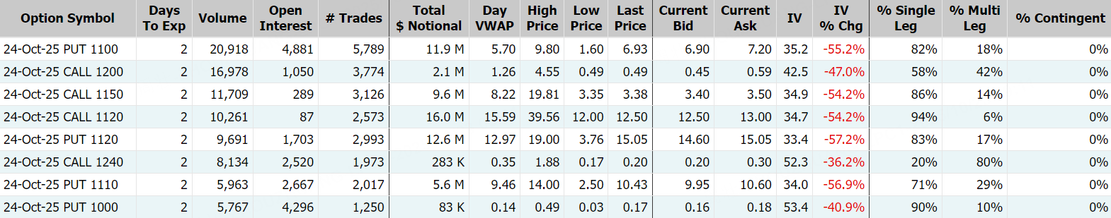 期权方面,奈飞当日期权成交近50万张,较90日均量放大4倍,看跌期权占比升至46.5%,其中于10月24日到期的1100美元行使价的看跌期权成交居前,成交超2万张。 $NFLX 20251024 1100.0 PUT$