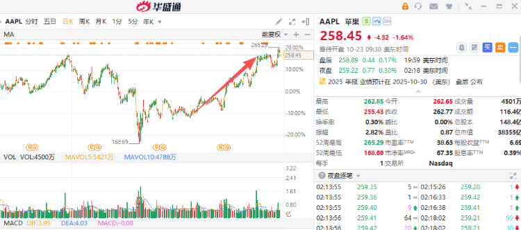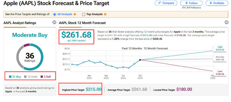 据TipRanks最新数据显示,多家华尔街大行绩前上调苹果目标价,58%的机构给予“买入”评级,当前平均目标价为261.68美元,最高目标价为315美元/股。