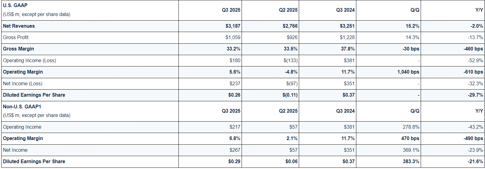 10月23日,意法半导体发布了2025年第三季度财报,公司净收入为31.9亿美元,同比下降2.0%。