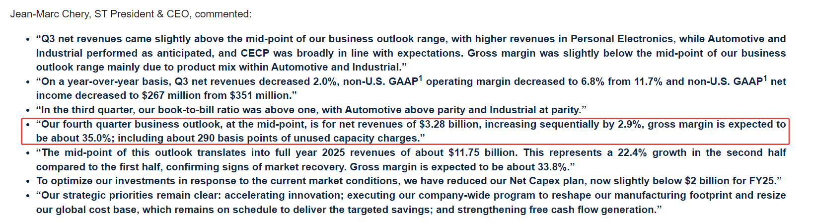 CEO Jean-Marc Chery表示,尽管第三季度业绩有所下滑,个人电子和汽车业务仍表现强劲。展望第四季度,公司预计将继续增长,并将加速创新与成本优化,确保未来可持续发展。
