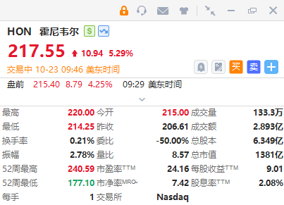 华盛资讯10月23日讯,霍尼韦尔涨5.29%,报217.55美元。
