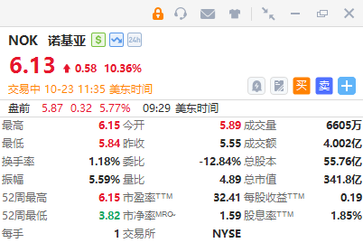 华盛资讯10月23日讯,周四,诺基亚大涨超10%,报6.13美元。消息面上,得益于网络基础设施和光网络业务的增长,诺基亚2025年第三季度盈利表现超出市场预期。财报显示,诺基亚Q3净销售额同比增长12%至48.28亿欧元,好于分析师平均预期的46.4亿欧元。调整后的营业利润同比下降10%至4.35亿欧元,但好于分析师平均预期的3.24亿欧元;调整后的每股收益为0.06欧元,与上年同期持平。